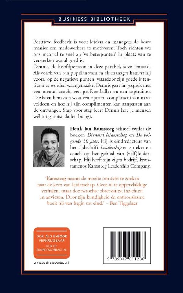 Dennis, de hoofdpersoon in deze parabel, is zo iemand. Als coach van een pupillenteam én als manager hamert hij vooral op de negatieve punten. Waardoor zijn goede intenties niet worden waargemaakt. Dennis gaat in gesprek met een mental coach, een profvoetballer en een toptrainer. Die laten hem onder meer zien waar een oprecht compliment aan moet voldoen en hoe hij zijn complimenten kan aanpassen aan de ontvanger. Stap voor stap leert Dennis hoe je mensen wél tot grootse daden brengt.