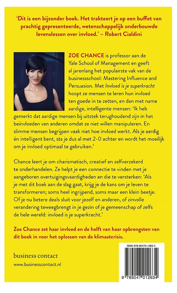 Zoë Chance is professor aan de Yale School of Management en geeft al jarenlang het populairste vak van de businessschool: Mastering Influence and Persuasion. Chance spreekt internationaal voor toonaangevende bedrijven en ngo’s en zet haar invloed in voor het redden van de planeet – en doneert de helft van haar opbrengsten van dit boek aan het oplossen van de klimaatcrisis.