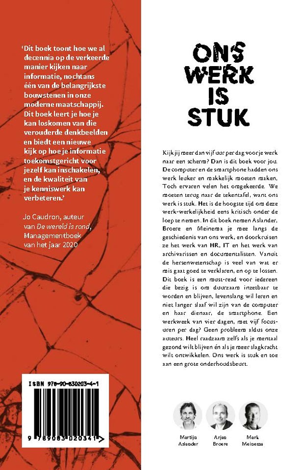 De computer en de smartphone hadden ons werk leuker en makkelijk moeten maken, toch ervaren velen het omgekeerde. We moeten terug naar de tekentafel, want ons werk is stuk. Het is de hoogste tijd om deze werk-werkelijkheid eens kritisch onder de loep te nemen. In dit boek nemen Aslander, Broere en Meinema je mee langs de geschiedenis van ons werk, en doorkruisen ze het werk van HR, IT en het werk van archivarissen en documentalisten.
