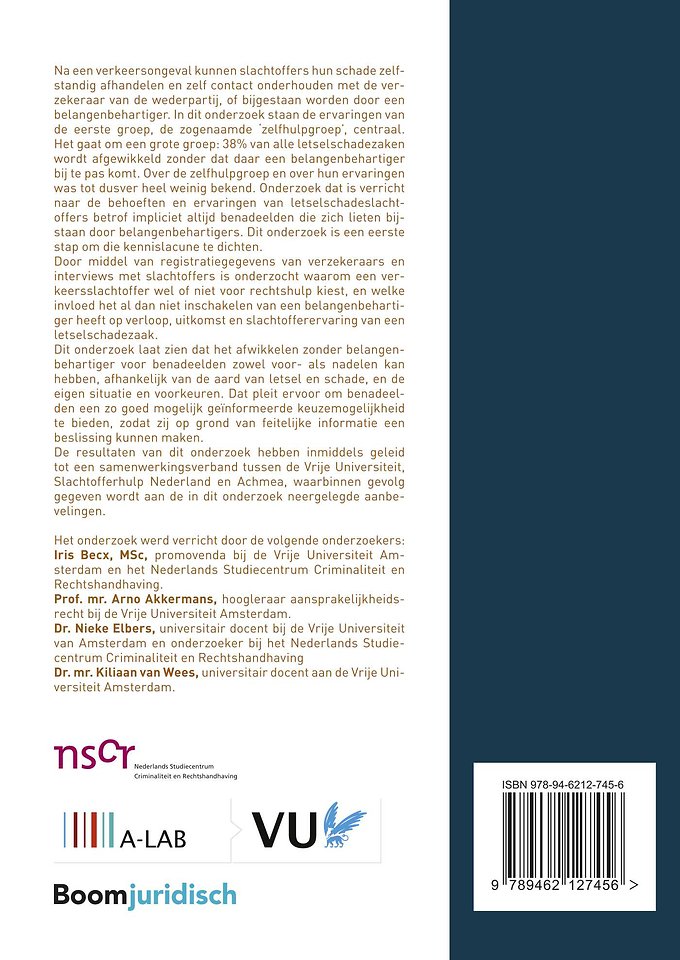 Over de zelfhulpgroep en over hun ervaringen was tot dusver heel weinig bekend. Onderzoek dat is verricht naar de behoeften en ervaringen van letselschade slachtoffers betrof impliciet altijd benadeelden die zich lieten bijstaan door belangenbehartigers. Dit onderzoek is een eerste stap om die kennislacune te dichten. Door middel van registratiegegevens van verzekeraars en interviews met slachtoffers is onderzocht waarom een verkeersslachtoffer wel of niet voor rechtshulp kiest, en welke invloed het al dan niet inschakelen van een belangenbehartiger heeft op verloop, uitkomst en slachtoffer ervaring van een letselschadezaak.