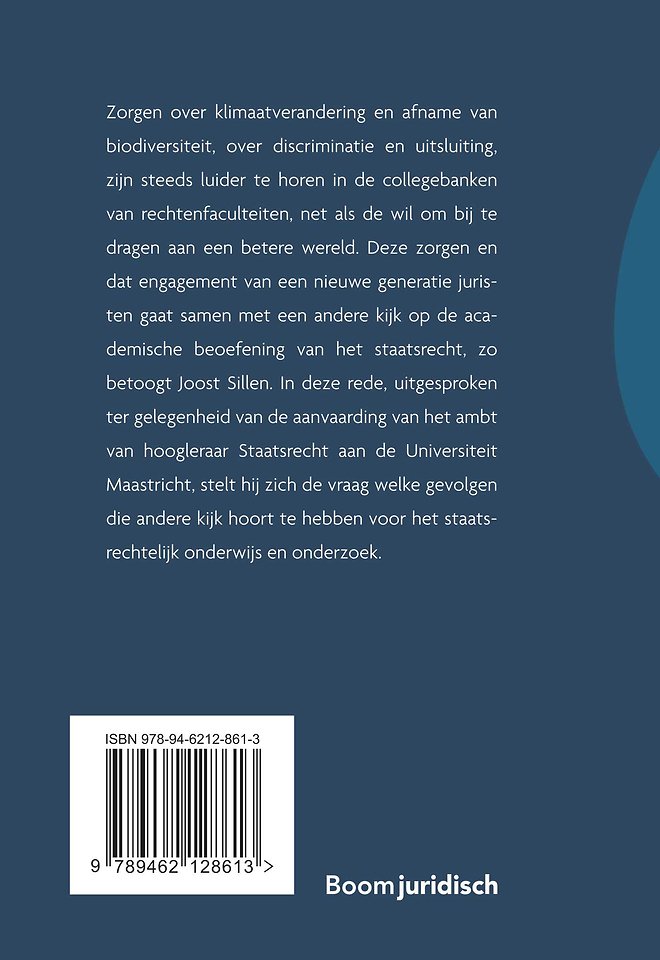 Zorgen over klimaatverandering en afname van biodiversiteit, over discriminatie en uitsluiting, zijn steeds luider te horen in de collegebanken van rechtenfaculteiten, net als de wil om bij te dragen aan een betere wereld. Deze zorgen en dat engagement van een nieuwe generatie juristen gaat samen met een andere kijk op de academische beoefening van het staatsrecht, zo betoogt Joost Sillen. In deze rede, uitgesproken ter gelegenheid van de aanvaarding van het ambt van hoogleraar Staatsrecht aan de Universiteit Maastricht, stelt hij zich de vraag welke gevolgen die andere kijk hoort te hebben voor het staatsrechtelijk onderwijs en onderzoek.