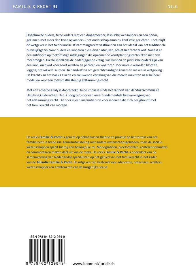 De kracht van het boek zit in de vernieuwende vertaling van die morele inzichten naar heldere modellen voor een toekomstbestendig afstammingsrecht.Met een scherpe analyse doorbreekt Hu de impasse sinds het rapport van de Staatscommissie Herijking Ouderschap. Het is hoog tijd voor een meer fundamentele heroverweging van het afstammingsrecht. Dit boek is een inspiratiebron voor iedereen die zich bezighoudt met het familierecht van morgen.