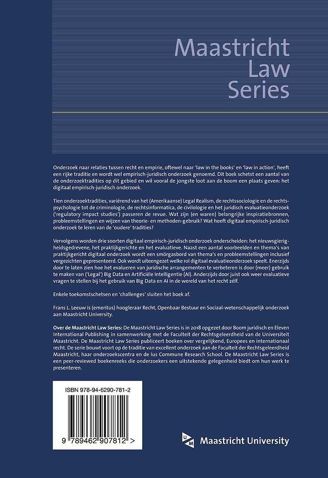 Onderzoek naar relaties tussen recht en empirie, oftewel naar ‘law in the books’ en ‘law in action’, heeft een rijke traditie en wordt wel empirisch-juridisch onderzoek genoemd. Dit boek schetst een aantal van de onderzoektradities op dit gebied en wil vooral de jongste loot aan de boom een plaats geven: het digitaal empirisch-juridisch onderzoek.