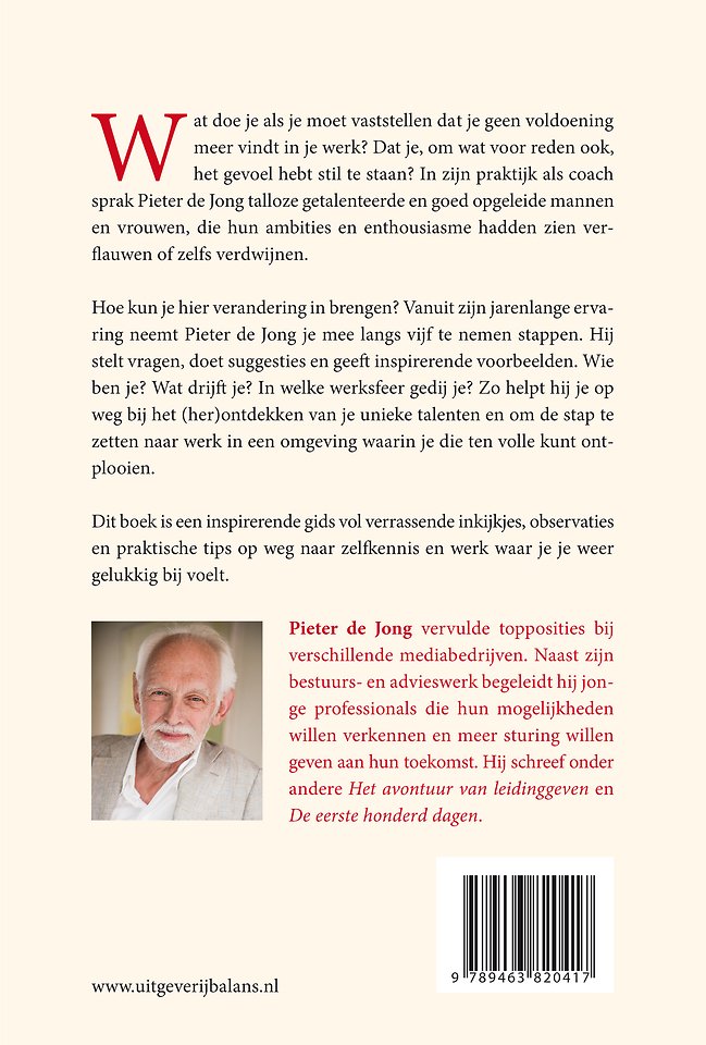 Hoe kun je hier verandering in brengen? Vanuit zijn jarenlange ervaring neemt Pieter de Jong je mee langs de vijf te nemen stappen. Dat doet hij to the point, kort en prikkelend. Hij stelt vragen, doet suggesties, geeft inspirerende voorbeelden. Wie ben je? Wat drijft je? In welke omgeving gedij je? Zo helpt hij je op weg bij het (her)ontdekken van je unieke talenten, om de stap te kunnen zetten naar werk en een omgeving waarin je die talenten ten volle kunt ontplooien.
