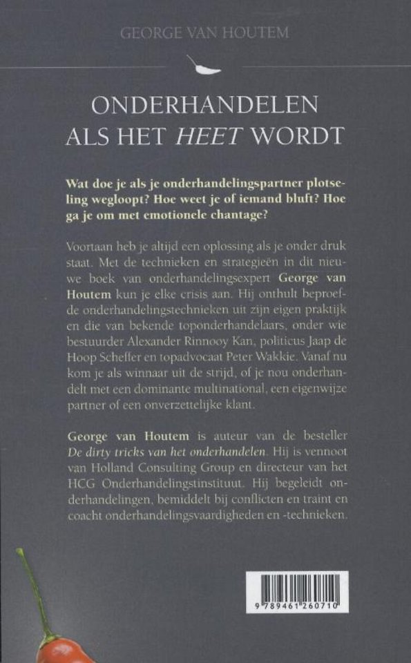 Na zijn bestseller De dirty tricks van het onderhandelen komt onderhandelingsexpert George van Houtem met een tweede boek over onderhandelen, Onderhandelen als het heet wordt. Waar de meeste boeken uitgaan van rationeel handelende onderhandelaars, geeft Van Houtem in dit boek munitie aan onderhandelaars die te maken krijgen met boze, schreeuwende, huilende of liegende onderhandelaars.