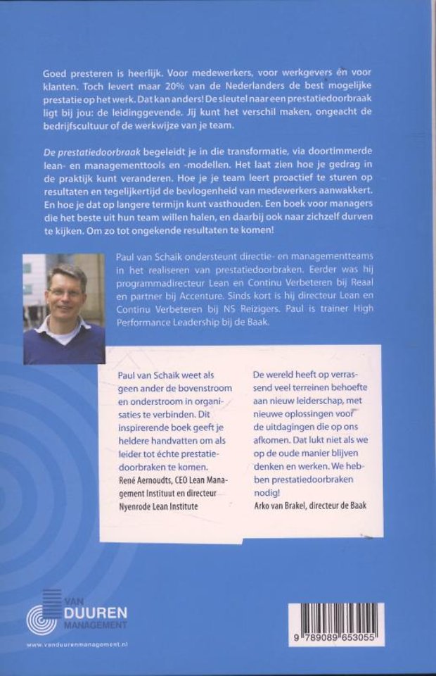 Iedereen, zowel medewerkers als manager, streeft ernaar om succesvol te zijn op het werk, onder meer door goed te presteren. Toch levert slechts 1 op de 5 Nederlanders een optimale prestatie op het werk. Paul van Schaik beschrijft in 'De prestatiedoorbraak' op welke wijze je als manager het verschil kunt maken, ongeacht de bedrijfscultuur of werkwijze van je team.